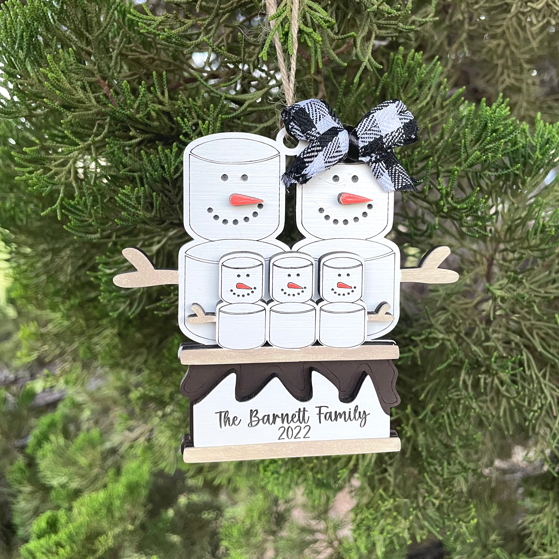 Yummy, cute smores family ornament for your tree. Perfect for the campfire loving family! Ornament includes two large snowmen and up to 6 small snowmen.